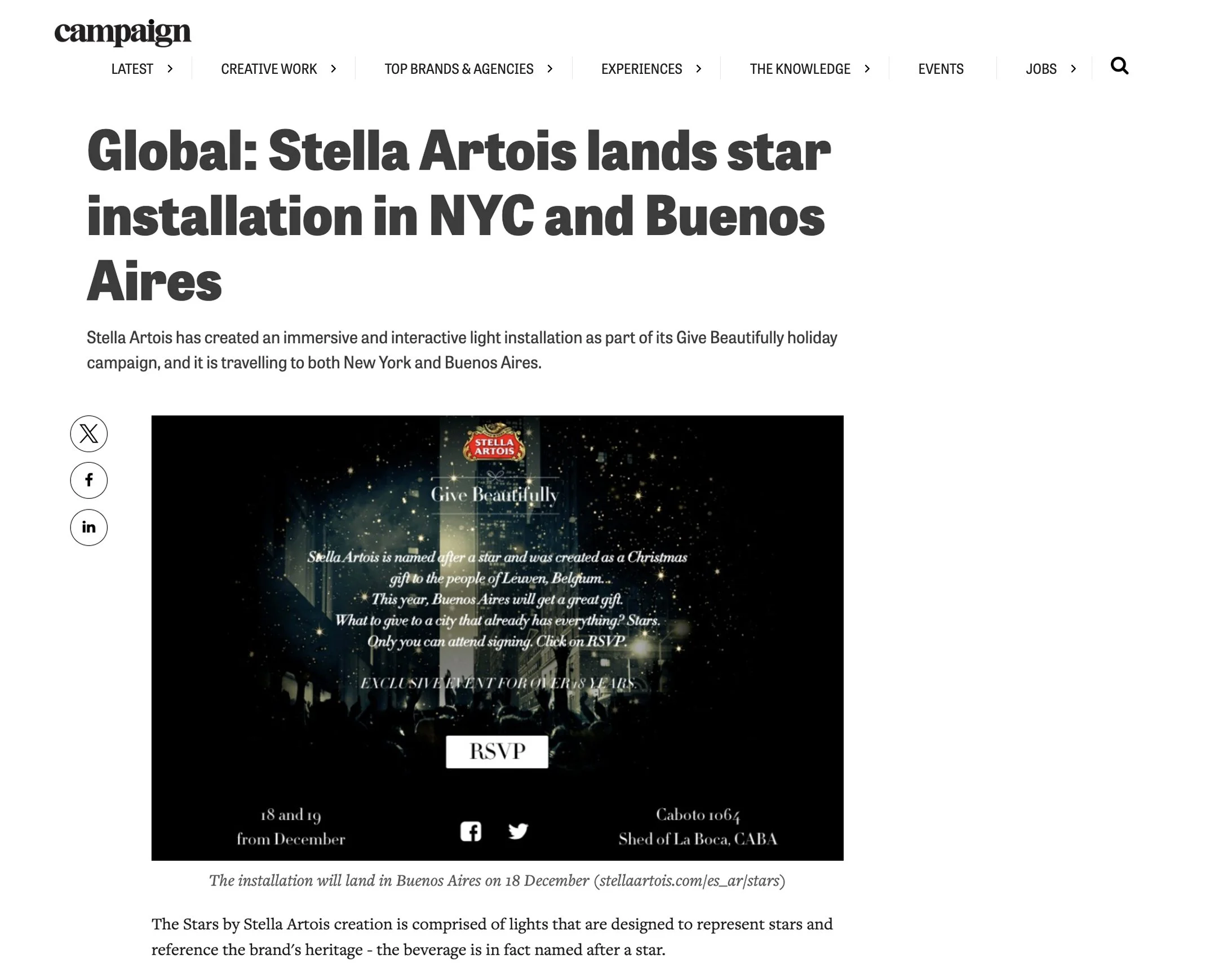 Stella Artois wanted to 'Give Beautifully' during the holiday season. So, we gave New York and Buenos Aires something they didn’t have: the stars. Inspired by the brand’s name, which means 'star' in Belgian, we created a starry installation that let people walk among the stars.